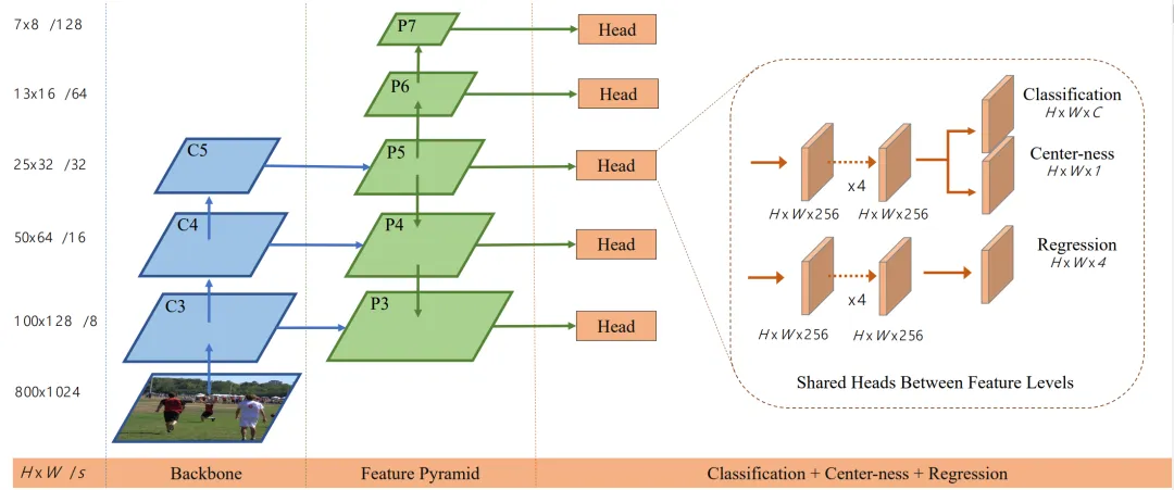 图10. FCOS网络结构,其中C3、C4和C5表示骨干网络的特征图,P3到P7是用于最终预测的特征等级。H×W为特征图的高度和宽度。'/s'(s=8,16,...,128)是该级别的特征图对输入图像的下采样率。作为示例,所有的数字都是用800×1024的输入计算的