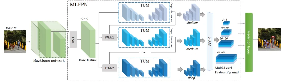 图6. M2Det(320 × 320)。M2Det利用骨干和多级特征金字塔网络(MLFPN)从输入图像中提取特征,然后生成密集的边界框和类别分数。在MLFPN中,FFMv1融合了骨干网的特征图来生成基础特征。每个TUM生成一组多尺度特征,然后由TUM和FFMv2交替联合提取多层次多尺度特征。最后,SFAM将这些特征聚合成一个多级特征金字塔
