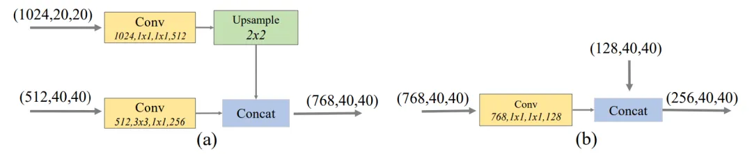 FFM用于融合M2Det中不同级别的特征,先通过1x1卷积压缩通道数,再进行拼接。具体而言:FFMv1使用两种不同scale的backbone里的feature map作为输入,所以在拼接操作之前加入了上采样操作来调整大小。FFMv2把相同尺度的base feature 和 前一个TUM的输出的最大feature作为输入,并产生融合了的feature送入下一个TUM。具体细节如下图所示。