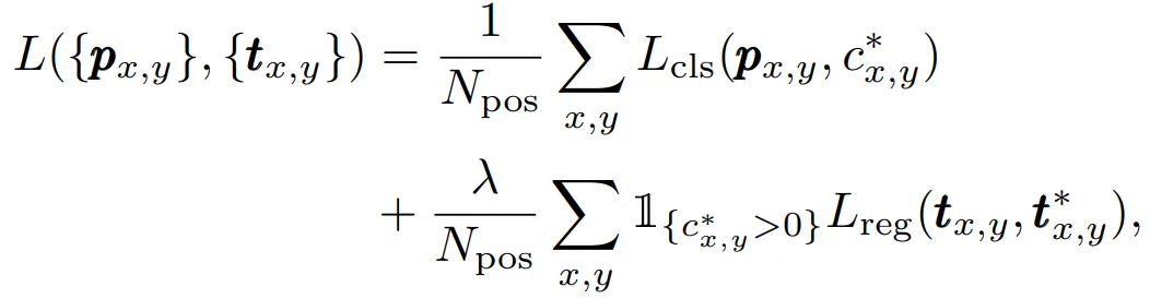 在骨干网的后面连接了 4 层卷积层,来进行分类和回归,并且由于回归的目标总数正的,所以,作者在回归分支的后面使用exp(x)来将任何(0,∞) 的实数进行映射。所采用的分类器就是C 个二分类分类器。所采用的损失函数如下: