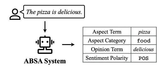 在梳理了之前的各种文章后,我们认为比较好的切入点是从 ABSA 中最核心的四个情感元素 aspect category, aspect term, opinion term, sentiment polarity 入手,具体的: