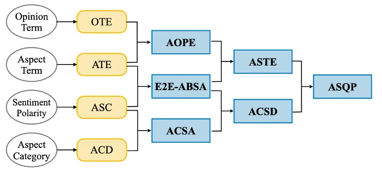 在梳理了之前的各种文章后,我们认为比较好的切入点是从 ABSA 中最核心的四个情感元素 aspect category, aspect term, opinion term, sentiment polarity 入手,具体的: