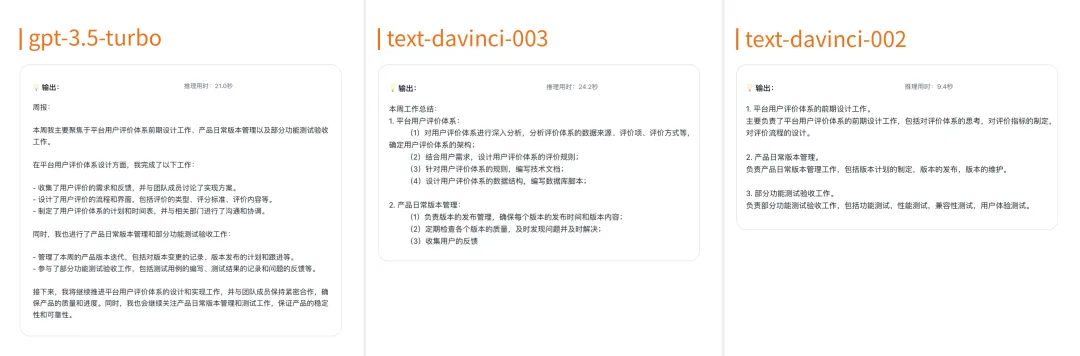 gpt-3.5-turbo 的输出相对其他两个模型更符合主题要求,大纲内容也更为丰富全面,包括了 AIGC 技术与内容产业的结合、成功案例和未来发展方向等方面的内容,整体质量较高。text-davinci-003 的输出同样有一定的可用性,但在与主题的相关程度方面稍有欠缺,主要是在介绍 AIGC 及其历史后,大纲中所提到的如何打开内容产业的大门和 AIGC 的未来等内容跟主题关系不够紧密,相对更为泛泛。text-davinci-002 的输出跟主题要求差距较大,虽然提到了 AIGC 作为一个内容生产公司的概述,但大纲内容更像是一段公司介绍,与主题并没有直接的关联,缺乏直播大纲的实际意义。场景四:工作周报