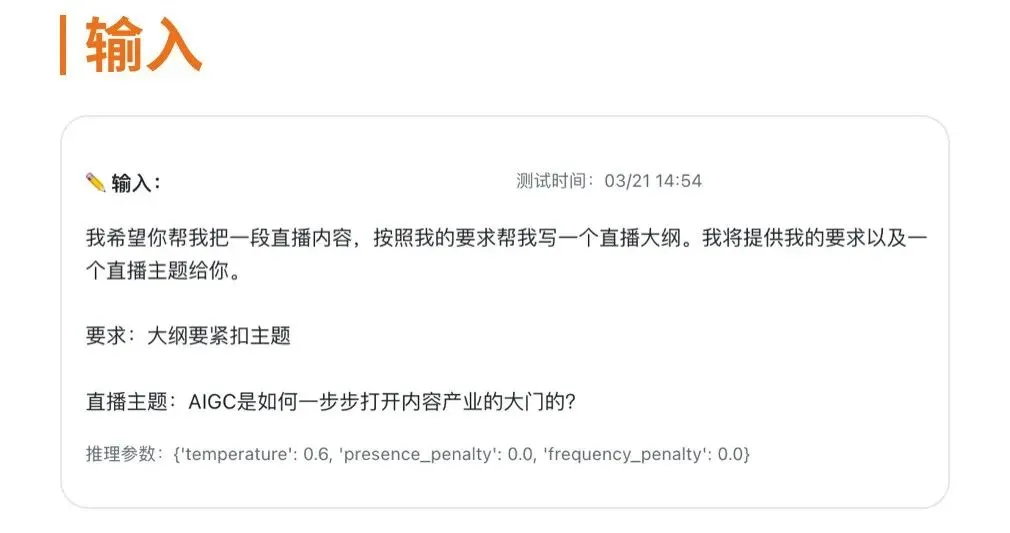 | 基于直播主题写一个直播的大纲 | 生成直播大纲的质量;跟主题的相关程度 |