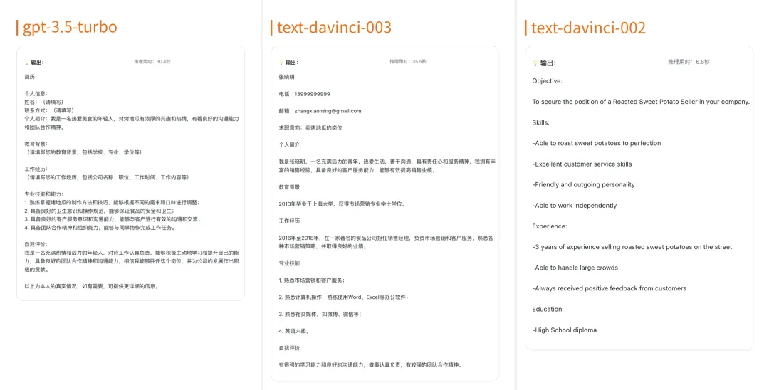 text-davinci-003:综合评分 1.9 分,缺少具体的项目案例和成果展示。没有针对招聘岗位的个性化描述。虽然简历中提到了符合招聘要求的多项条件,但是没有根据招聘岗位的特点和需求来进行具体的描述和突出。缺乏量化的成果描述。语言表述不够简洁和精准。text-davinci-002:综合评分 1.3 分,整体输出信息量太少,不具备任何符合标准简历的基础信息要求,描述语句过于简短缺乏明确的求职目标,缺乏个性化和针对性,缺乏量化指标,经验和技能描述较为简单,格式较为简单,不符合规范,模型表现较差。我们选取其中一个测例展开看看 ——消耗成本基于求职岗位生成简历模板测例,gpt-3.5-turbo 约消耗 0.0077 元,text-davinci-003 约消耗 0.1 元,text-davinci-002 约消耗 0.022 元推理输出在生成模板专业度和匹配度方面,可以看到 gpt-3.5-turbo 和 text-davinci-003都能够提供比较完整的简历模板,包含了个人信息、教育背景、工作经历、专业技能和自我评价等关键要素,并且在格式上也比较规范。但如果仔细看,可以看到 text-davinci-003 存在明显与现实认知有冲突的地方,没有具体描述岗位要求和个人能力之间的匹配,比如专业技能部分中,候选人熟悉计算机操作、英语六级,却缺乏与卖烤地瓜岗位相关的专业技能和知识。而 text-davinci-002 则相对简略,只提供了应聘者的目标、技能、经验和教育背景等基本信息。3个 GPT 3.5 系列模型对比总结在面试场景任务中,gpt-3.5-turbo 综合评分最高,能够很好地适应面试场景,生成的问题具有较高的针对性和多角度深入了解候选人的能力和经验;而 text-davinci-002 的评分最低,问题过于宽泛且基本是对岗位描述的重复,缺乏挑战性和实际性的问题,甚至出现生成的内容完全不可用的情况。在英文邮件写作场景任务中,gpt-3.5-turbo 和 text-davinci-003 的综合评分较高,能够模拟口语和正式书面的语言风格,对于口语化的表达和带有歧义的名词有很好的理解和翻译,但也无法正确地识别不安全的内容;而 text-davinci-002 的评分最低,口语与书面语不能很好切换,没有正确的识别不安全的内容。在直播场景任务中,gpt-3.5-turbo 的评分最高,能够准确、精炼、流畅地概括直播内容,并符合要求中的简洁度要求;而 text-davinci-002 的评分最低,输出准确度一般,不能很好地适应场景,但在简洁性和流畅性方面还有进一步改进的空间。在写工作周报场景任务中,gpt-3.5-turbo 和 text-davinci-003 的评分较高,能够准确呈现出周报的逻辑结构和内容要点,输出的内容较为完整;而 text-davinci-002 的评分最低,缺乏表达周报的逻辑,结构不匹配,内容不贴切。在简历场景任务中,gpt-3.5-turbo 的评分最高,能够专业化地生成符合招聘方要求的简历,并呈现出教育背景、工作经验、技能掌握以及自我评价等方面的信息,但需要更加注重语言表达的精准和个性化;而 text-davinci-003 和 text-davinci-002 的评分较低,缺乏个性化和量化的成果描述,简历的描述也较为简单和缺乏条理。对于以上五个应用任务的综合评价如下。以下评价仅代表对这些模型在特定应用场景下的评价,针对其他应用场景或任务,评价可能有所不同。其中一些模型还在迭代的过程中,可能将会有更好的表现和性能。在未来的测试中,我们也将增加GPT系列的新模型(如GPT-4)的对比情况。