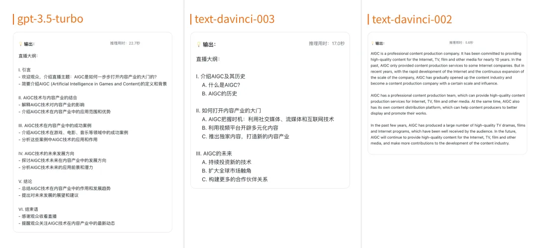 gpt-3.5-turbo:综合评分 4.4 分,模型准确且精确地实现了用户提出的要求,在输出内容中与输入相呼应,切合主题场景,表述准确,没有遗漏或歪曲原始信息,能够精炼地组织问题答案,遵循了要求中的简洁度要求,输出流畅,句子结构简洁明了,表述清晰。text-davinci-003:综合评分 4.2 分,模型总结准确性较高,生成内容符合场景需求,没有遗漏信息同时没有添加不必要的信息,语言流畅度也较好,符合内容流畅性和简洁度的要求。然而,需要提高精炼程度,简化语言,同时生成的内容没有提供额外的分析和见解,需要提高广度和深度。text-davinci-002:综合评分 1.5 分,模型输出准确度一般,有些基本覆盖问题点,大多不能较好地适应场景,生成句子结构较为复杂,词语冗余现象明显,语言表述略显生硬,可能会影响读者对文本的理解和阅读流畅性,在简洁性和流畅度方面还有进一步改进的空间。我们选取其中一个测例展开看看 ——成本消耗基于直播主题写一个直播的大纲测例,gpt-3.5-turbo 约消耗 0.01 元,text-davinci-003 约消耗 0.11 元,text-davinci-002 约消耗 0.071 元推理结果