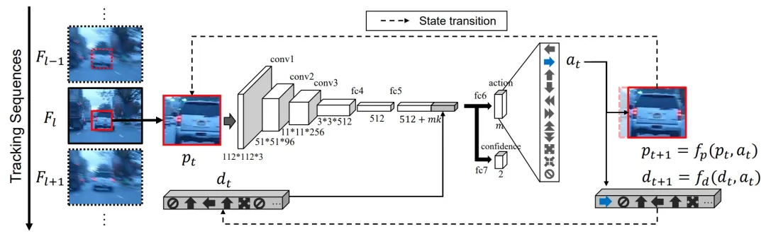 图4 网络结构。虚线表示状态转换。在这个例子中,选择 "向右移动 "的动作来捕捉目标物体。这个动作决定过程不断重复,直到最后确定每一帧中目标的位置