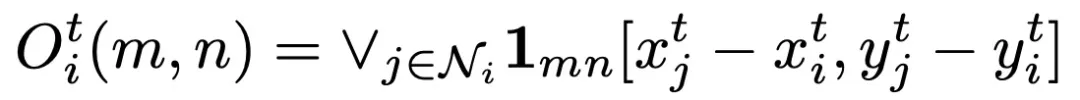 最后是交互模型(I)。交互模型主要用于处理目标与其周围事物的作用力关系。由于目标附近的其他目标数量是会发生变化的,为了使网络模型使用相同的输入大小,本文将每个目标的周围都建模成固定的"占有块"。和运动模型的结构相同,只有输入变成了"占有块图",其余皆不变。把每个目标的周围区域建模为一个固定大小的occupancy grid(可被占用的网格图,0/1)。交互特征提取器对以目标target为网格中心,生成一张网格图,并转化为向量表达。如果周围某物体的bbox中心落在网格(m,n)处,则网格(m,n)位置处标为1,不被占用的网格位置为0。网络结构如图11。数学公式表达为: