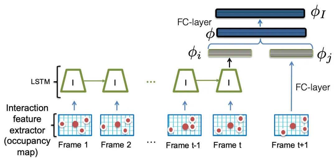 图11 交互模型,输入是跨时间的占用图(在图像平面上)。输出是一个特征向量φI,它编码了时间t+1的占用图是否对应于时间1、2、...t的占用图的真实轨迹