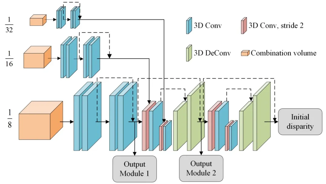 接下来对代价体进行融合。如图7,首先对每个 cost volume 使用 4 个具有skip connection的 3D 卷积层(每个分支的前四个蓝色块)。使用stride = 2 的 3D 卷积将 scale3 的分辨率从 1/8 降到 1/16。然后将下采样后的 scale3 和 scale4 拼接再通过一个额外的 3D 卷积将特征通道缩放。继续采取类似的操作来逐步将 scale3 的 cost volume 下采样到原始输入图像分辨率的 1/32与 scale5进行信息融合 ,最后采用 3D 转置卷积对 cost volume上采样并对上采样后的 cost volume 利用特征信息进行细化。对细化后的 cost volume 进行视差回归(soft argmin operation)就可以得到初始视差图: