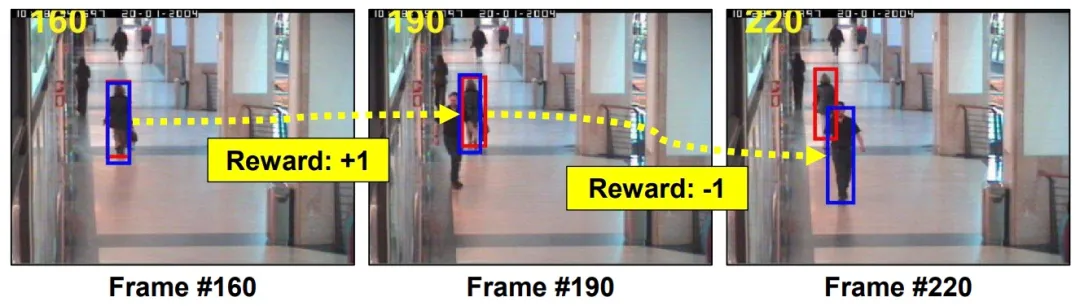 图5 半监督情况下对Walking2序列的追踪模拟说明。红框和蓝框分别表示ground-truth和预测的目标位置。在这个例子中,只有#160、#190和#220帧被注释了。通过连续的行动,agent在#190帧获得+1奖励,在#220帧获得-1奖励。因此,从#161到#190帧的追踪得分将是+1,#191和#220之间的追踪得分是-1