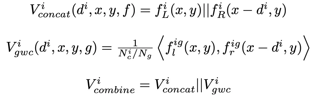 融合代价体。文中提出融合多个低分辨率密集代价体(小于原始输入图像分辨率的1/4的代价体,代码中是1/8,1/16,1/32),以减少初始视差估计中不同数据集之间的域差异 (domain shifts)。很多工作都意识到多尺度代价体的重要性,但这些工作通常都认为低分辨率的代价体特征信息不足,无法生成准确的视差图,所以弃之不用。但文中认为不同尺度的低分辨率代价体可以融合在一起提取全局结构化表示,其生成的初始视差图更加准确(鲁棒)。具体的,在每个尺度上分别构建低分辨率成本体积,文中同时使用特征拼接(feature concatenation)和组相关(group-wise correlation)来生成融合代价体,公式如下: