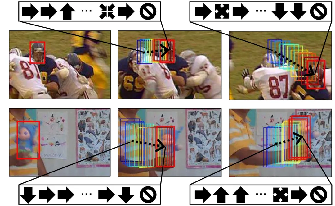 图3 本文提出的由顺序动作控制的视觉追踪的概念。第一列显示了目标的初始位置,第二和第三列显示了在每一帧中寻找目标边界框的迭代动作流程