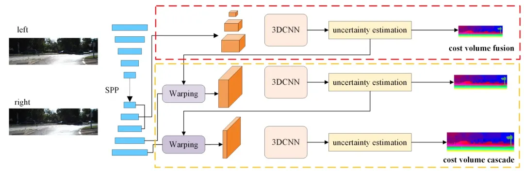 图6 CFNet整体结构,网络由3部分组成:金字塔特征提取网络、融合代价体和级联代价体