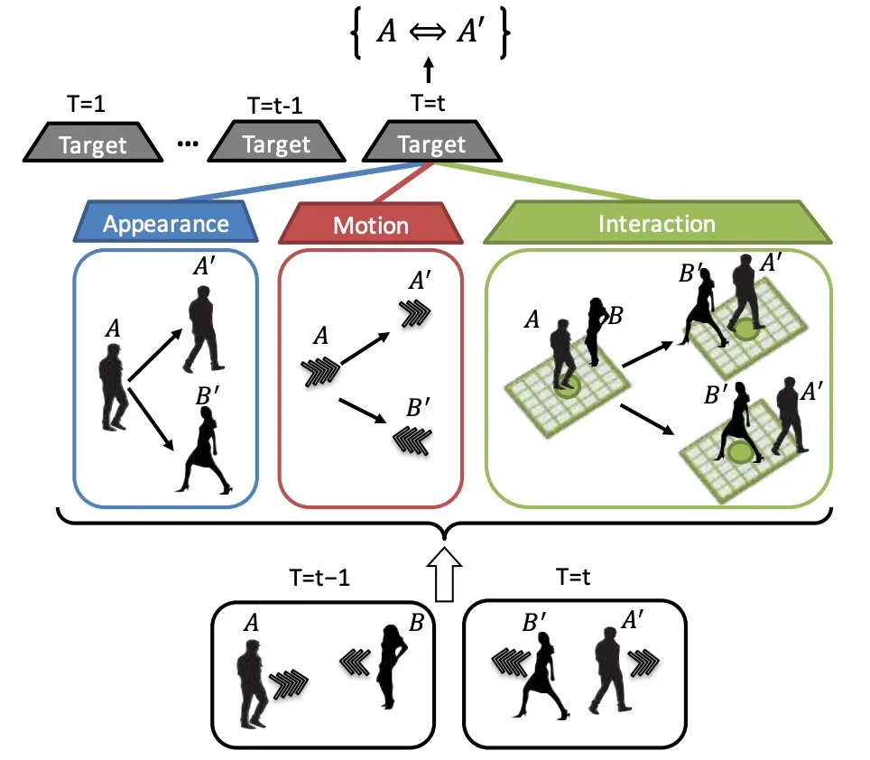 本文提出了一种对长时间存在的多线索依赖关系进行编码的在线追踪方法。其中,为了解决不能很好地对发生遮挡或具有相似外观环绕的目标进行区分追踪的问题,本文提出使用RNN架构、结合一定时间窗内的多线索来进行追踪的方法。通过该方法,我们可以修正数据关联的错误,以及从被遮挡状态中恢复原目标观测。本文证明了使用目标的外观、运动以及交互这三个方面来进行数据驱动的追踪算法的鲁棒性。