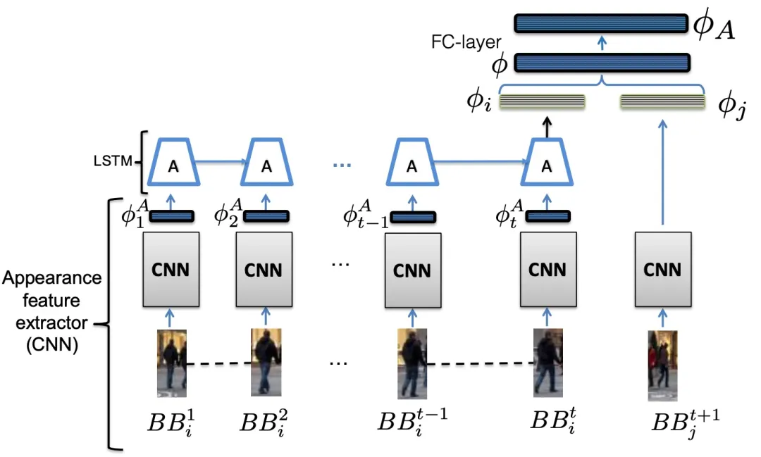 图9 外观模型。输入是目标i从时间1到t的bounding box,以及我们希望比较的时间t+1的检测j。输出是一个特征向量φA,它编码了时间t+1的bounding box是否与时间1、2、...的特定目标i相对应。使用一个CNN作为外观特征提取器