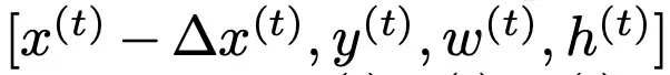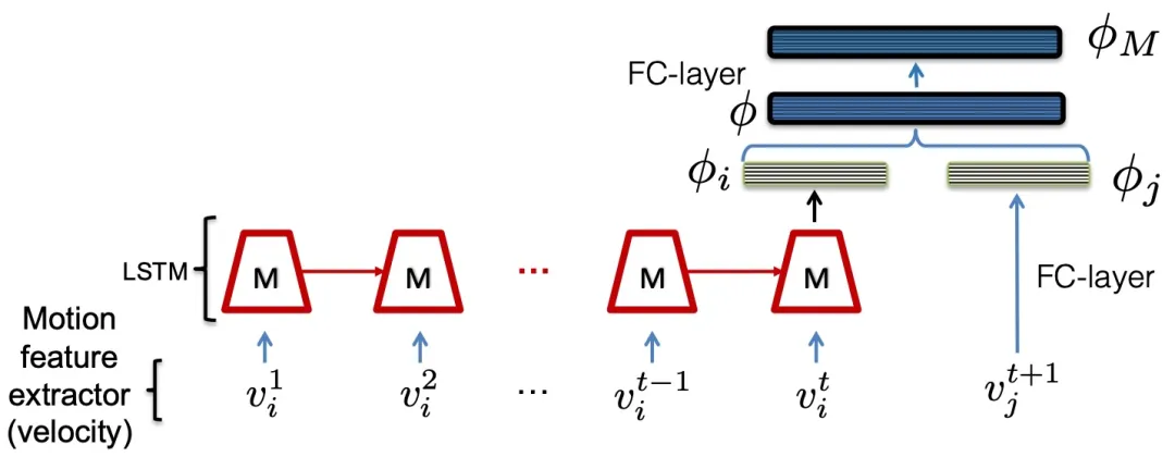 图10 运动模型,输入是目标的二维速度(在图像平面上)。输出是一个特征向量φM,用于编码速度v_{j}^{t+1}是否对应于真实轨迹v_{i}^{1}, v_{i}^{2}, .... , v_{i}^{t}