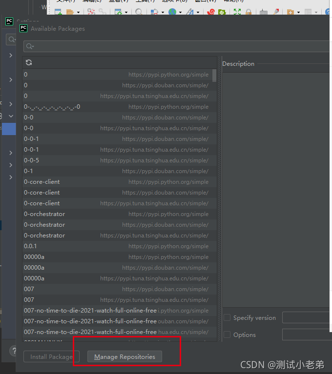 1,点击 file--settings--project:xxx----python lnterpreter ,进入下载页面后点击左上角的“”+“”号,进如下载页面,,点击加号后进入到了“”available packages“”页面,在页面的底部点击"manage repositories"