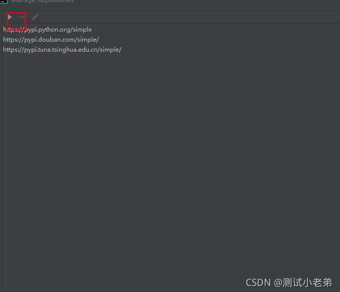 2,进入到“manage repositories”"页面,在这个页面点击左上角的“”+“”号,在弹出的输入框里可以输入一些下载的源地址
