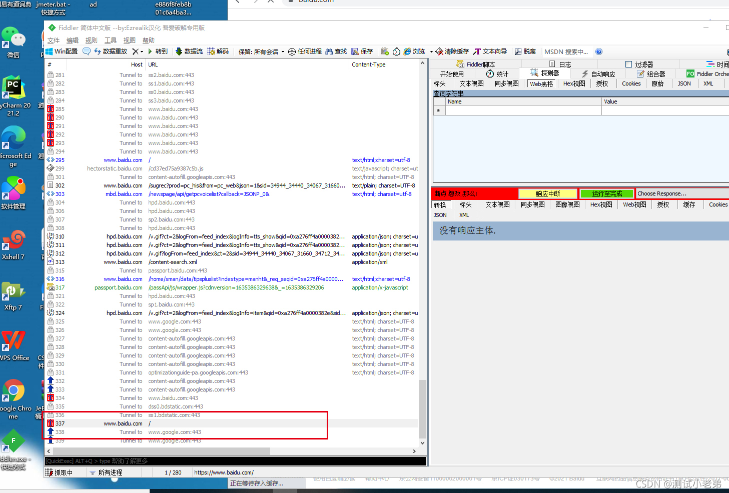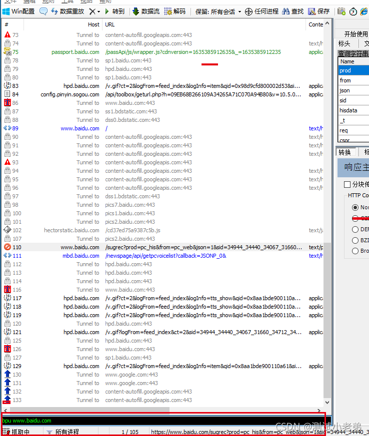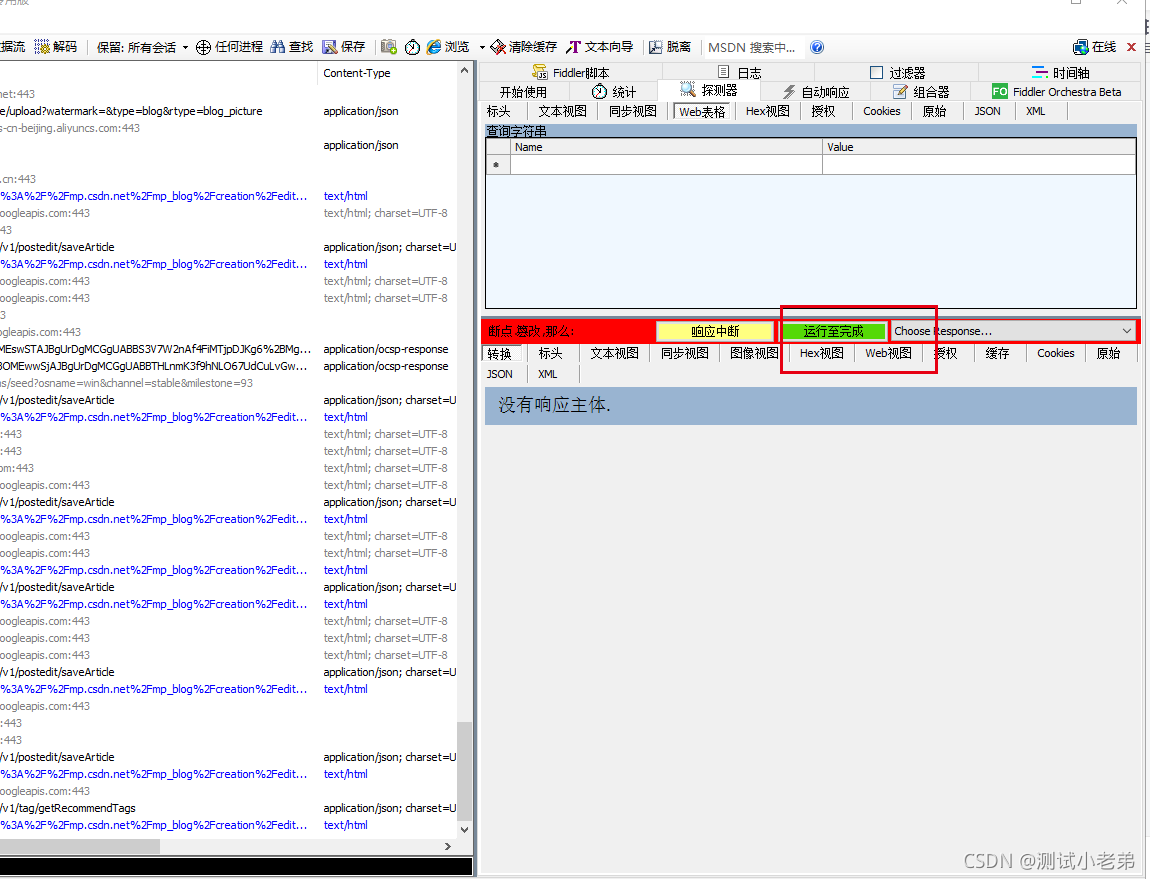 2,设置完截取的url后,我们就可以正常再浏览器访问页面,当fidder监控到url后会再页面上打上红色标志,然后截取到这个接口