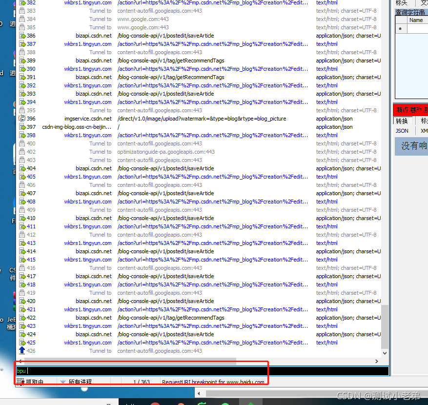 1,打开fidder,在fidder底部页面的输入框里输入bpu xxxxx(代表要截取数据的url),输入后点击回车