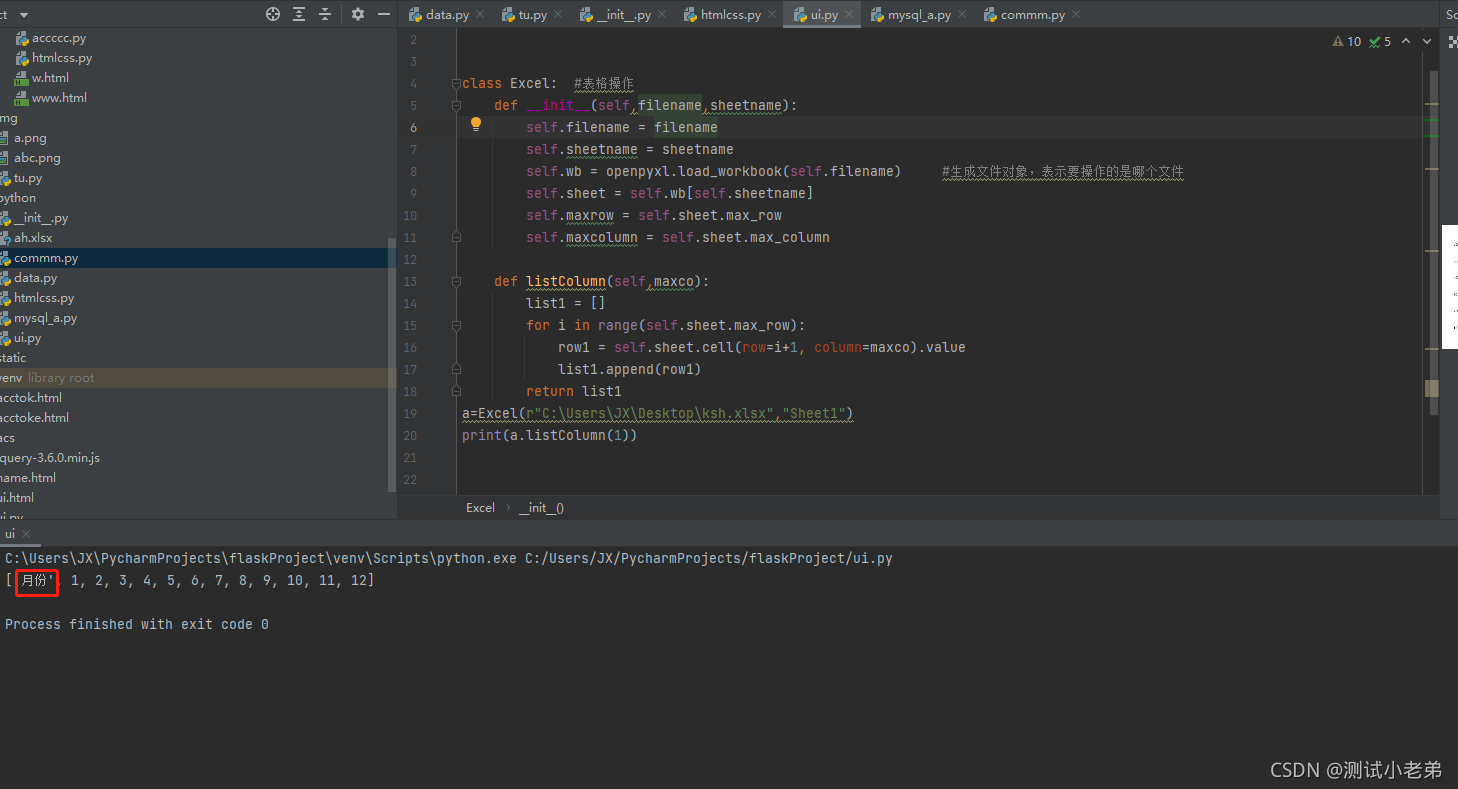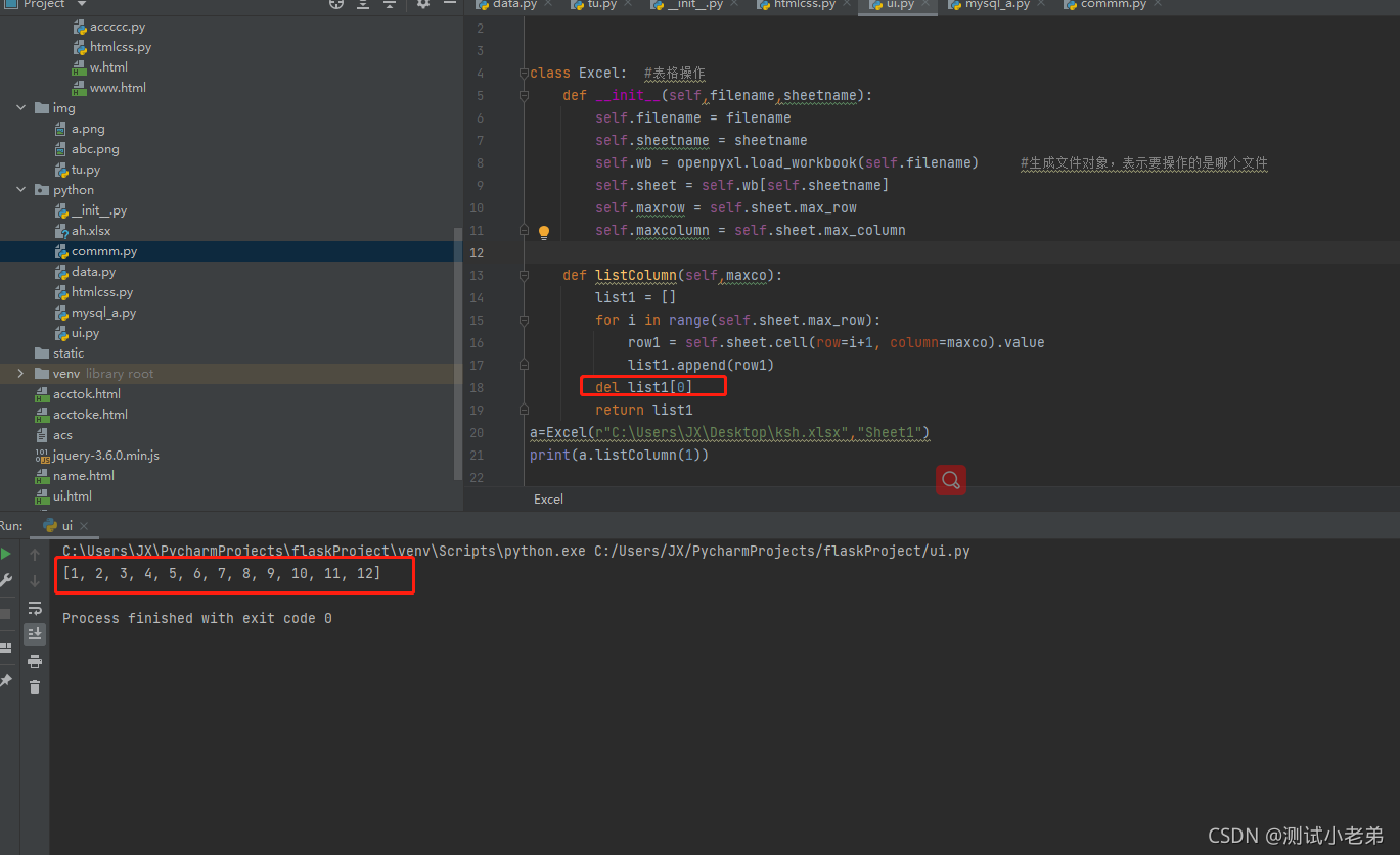 我这里先使用python的openpyxl模块定义了一个class。这个def主要是读取表格中指定的列,我们先看下效果。