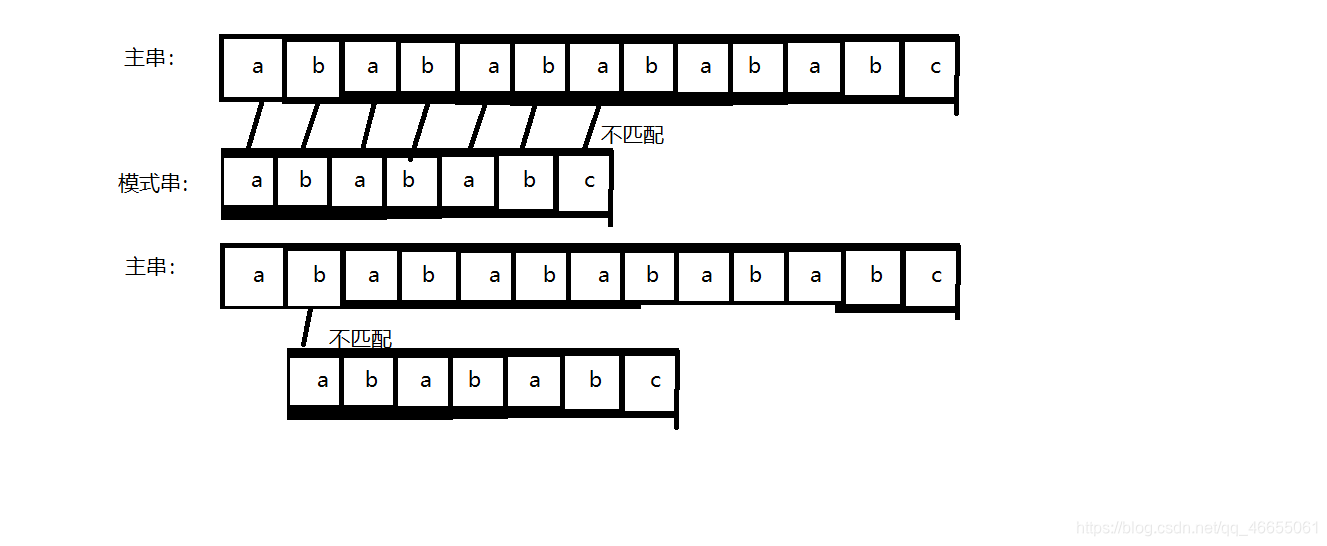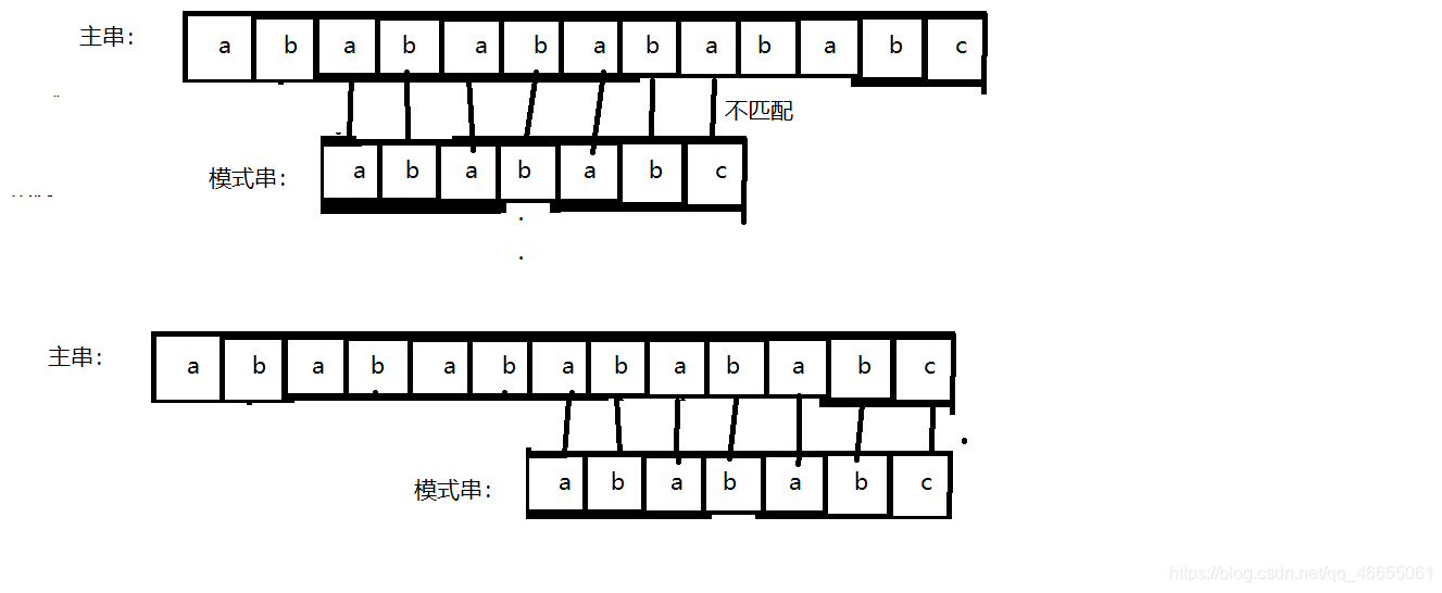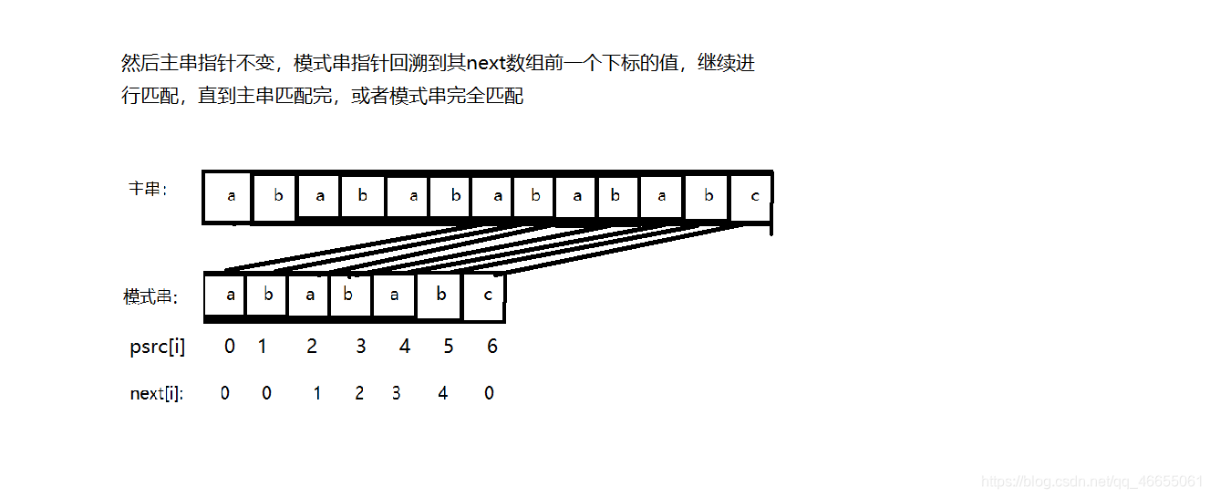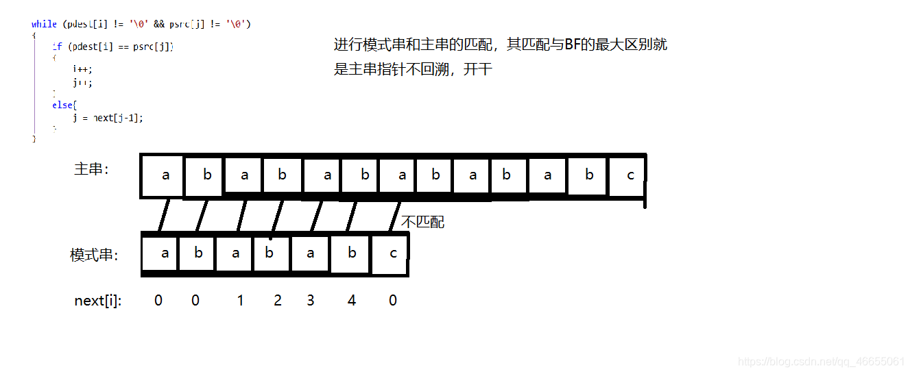 j=next[j]; //匹配失败后,模式串向右移动,i指针不动