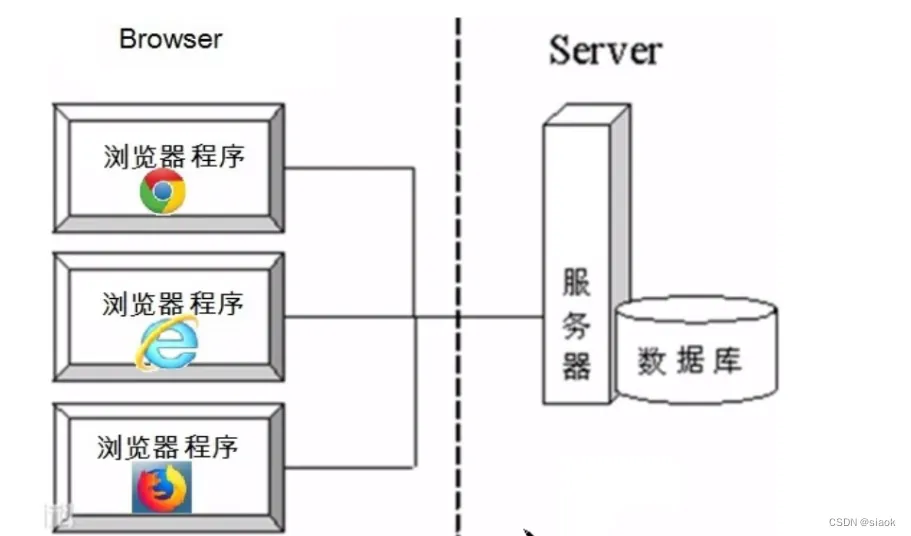 - B/S结构: 全称为Browser/Server结构,是指浏览器和服务器结构。常见浏览器有IE、谷歌、火狐等.