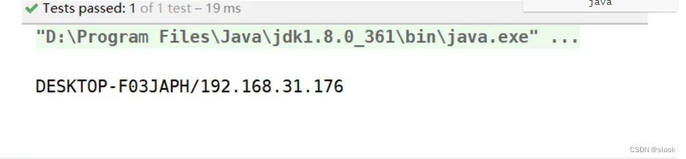 @Test public void test01() throws UnknownHostException { //获取本地主机名和IP地址 InetAddress localHost = Inet4Address.getLocalHost(); System.out.println(localHost); }