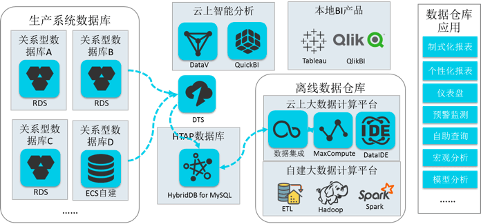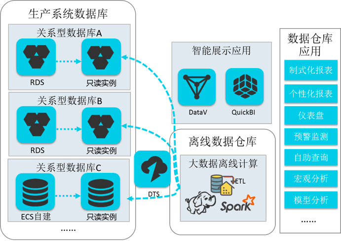 1、为了满足分析需要,ETL策略为ELT(Extraction-Loading-Transformation),将全量数据同步到大数据平台中(MaxCompute、EMR、或自建Hadoop)中进行离线运算,定期完成数据整合后供如决策支持类分析型应用使用。 2、自建或者云上的大数据平台拉取生产数据: a)不允许入侵到生产库,以免引起生产库的性能波动。 b)生产数据库申请只读实例,并设定相关权限。 c)大数据平台可通过同步工具(DTS、CDP等)访问只读实例,也可写相应调度任务和程序访问。 d)根据访问要求设置只读实例相关访问权限。 |