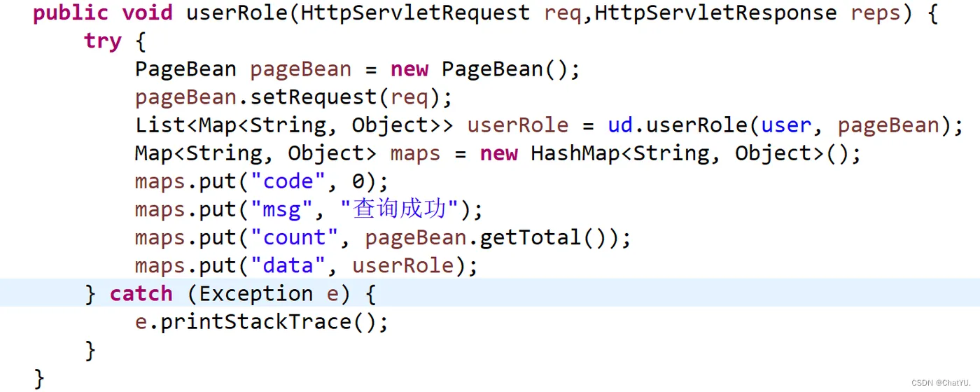 public void userRole(HttpServletRequest req,HttpServletResponse reps) { try { PageBean pageBean = new PageBean(); pageBean.setRequest(req); List<Map<String, Object>> userRole = ud.userRole(user, pageBean); Map<String, Object> maps = new HashMap<String, Object>(); ResponseUtil.writeJson(reps, R.ok(0, "查询成功",pageBean.getTotal(), userRole)); } catch (Exception e) { e.printStackTrace(); } }
