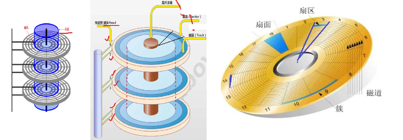磁头(head) 柱面(cylinder) 扇区(sector)
