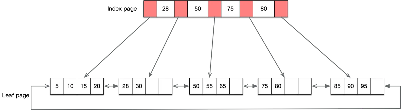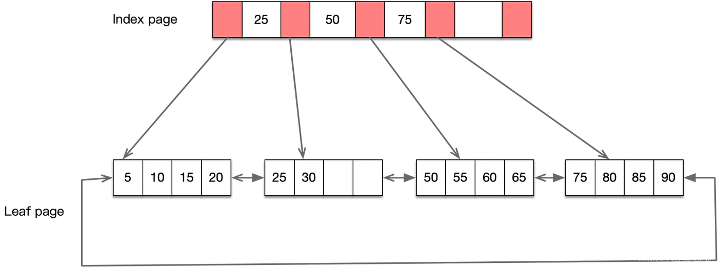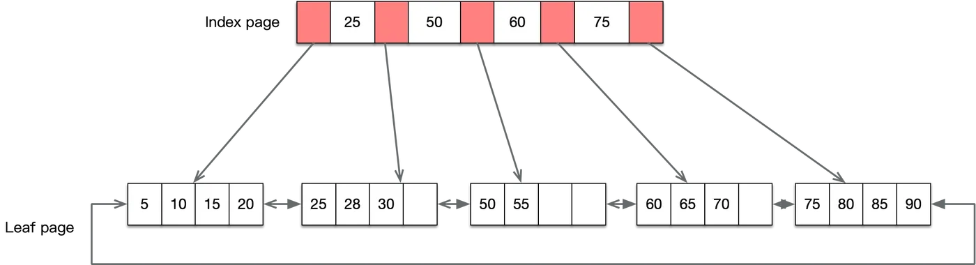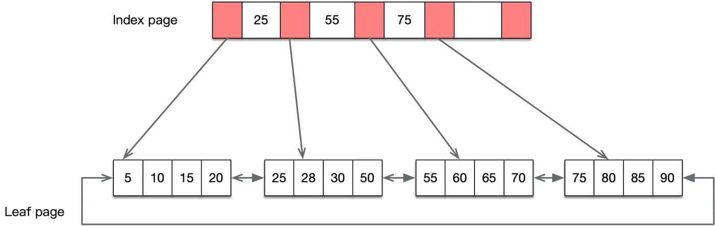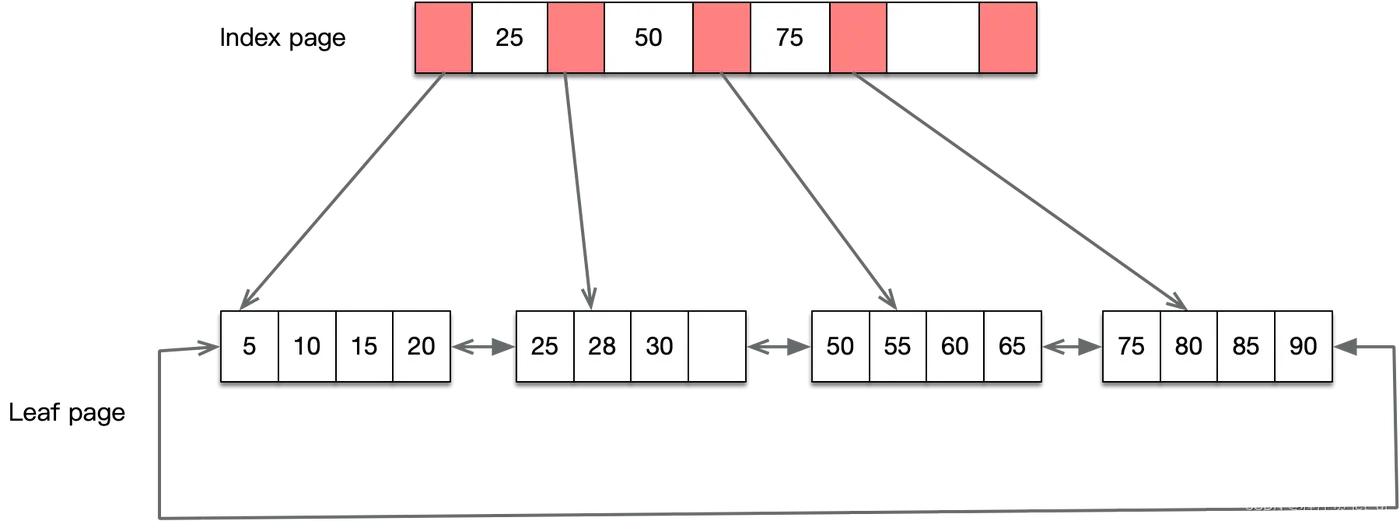- B+树是b树的变种,主要区别在于:B+树的非叶子节点只存储 key + 指向下一层节点的指针。另外,B+树的叶子节点之间通过指针来连接,构成一个有序链表,因此对整棵树的遍历只需要一次线性遍历叶子结点即可。