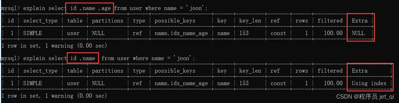 explain select * from person where NAME='name1'; explain select NAME,SCORE from person where NAME='name1';