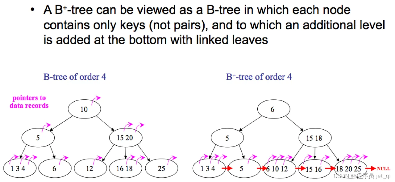 - 通常在B+树上有两个头指针,一个指向根节点,另一个指向关键字最小的叶子节点。