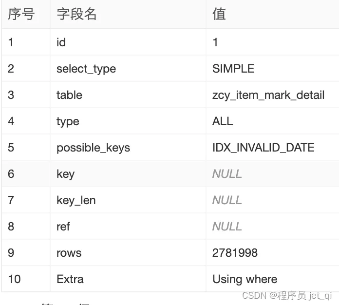 - 主要关注 type、key、row、extra 等字段。主要是看是否使用了索引,是否扫描了过多的行数,是否出现 Using temporary、Using filesort 等一些影响性能的主要指标。
