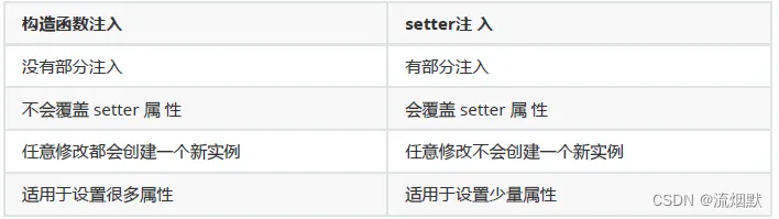 两种依赖方式都可以使用,构造器注入和Setter方法注入。最好的解决方案是用构造器参数实现强制依赖,setter方法实现可选依赖。