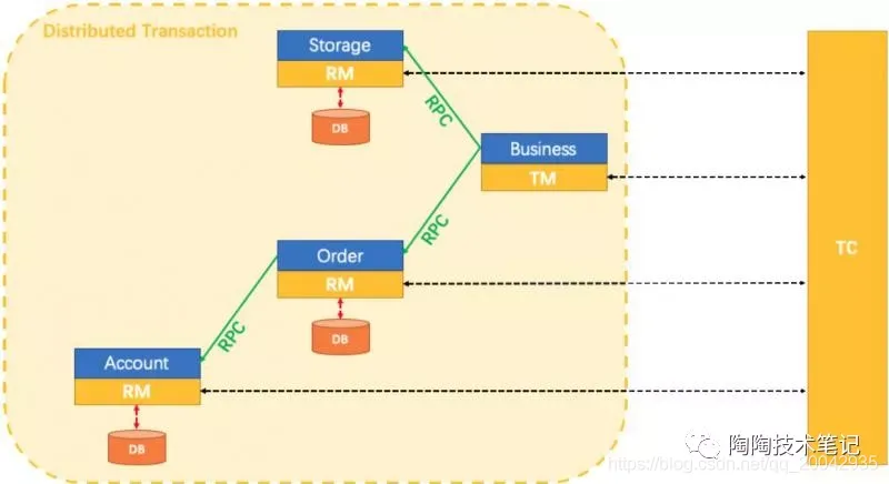 - RM:具体的事务资源,每一个 RM 都会作为一个分支事务注册在 TC。
