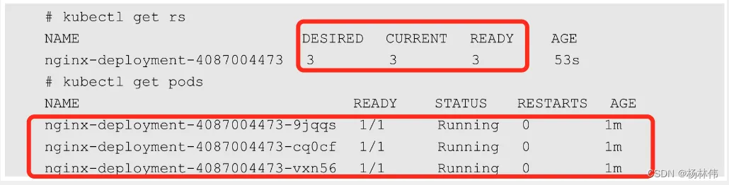 通过运行kubectl get rs和kubectl get pods可以查看已创建的ReplicaSet (RS)和Pod的信息。