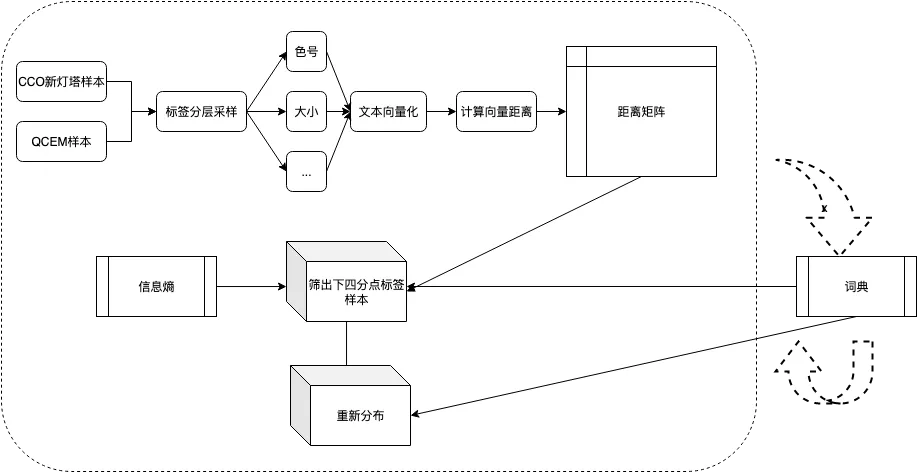 标签结构设计自动化评估的整体方案为:基于VOC样本集,按照标签进行分层采样,对文本进行向量化后,计算不同标签之间的文本距离,输出文本距离矩阵。之后对出先聚集情况的标签做重点分析,对需要重新设计的标签按照不同的合并方案进行调整,给出最优的标签结构。最后引入人工词典作最后校正,评估策略和调整方案的可靠性。