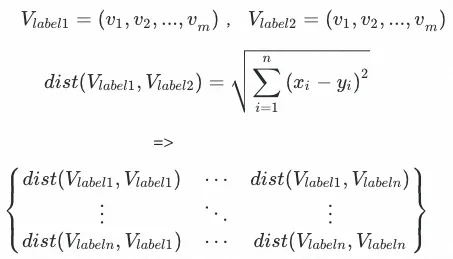 标签文本向量距离矩阵及其分析:计算个标签对之间的欧式距离,形成标签距离矩阵。