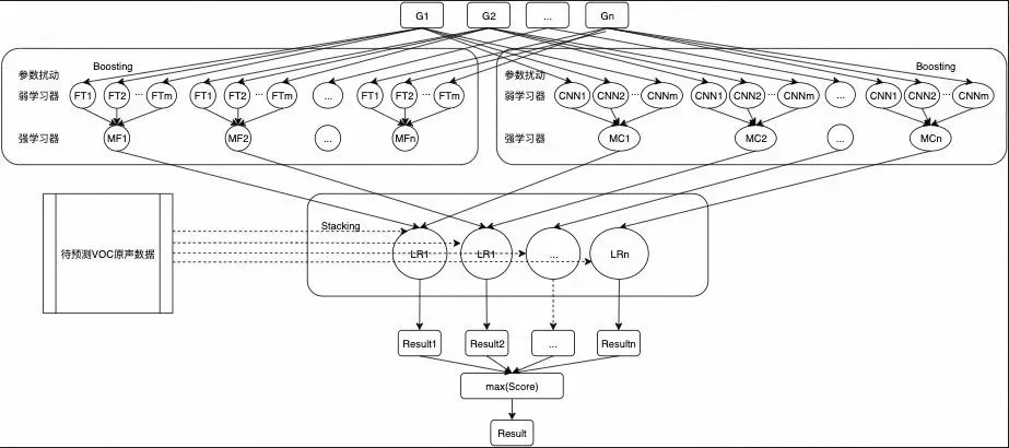 在stacking基学习器的内部采用Boosting集成方法,通过参数扰动,针对每个样本生成n个弱学习器队列,每个弱学习器队列中包含m个弱学习器,形成2个弱学习器矩阵。基于Boosting融合,最终得到两个强学习器队列分别为以下两个: