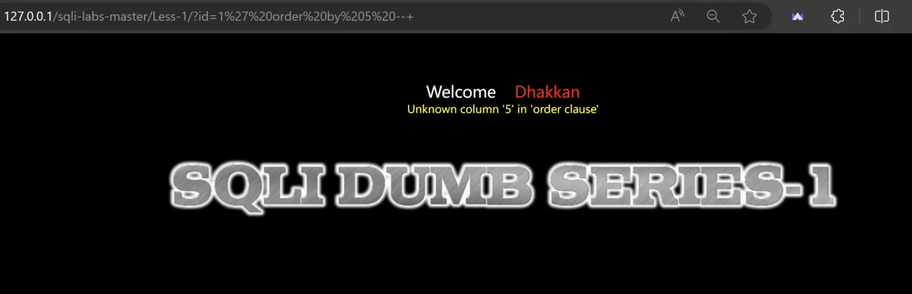 构造?id=1' order by 5 --+,出现如图回显,说明5超出了数据表中列的范围