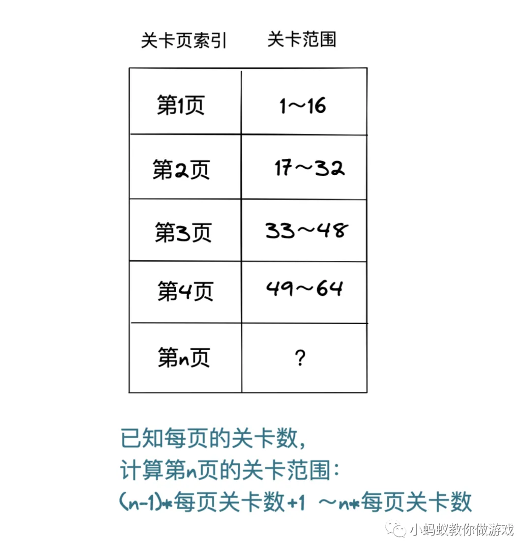 如图,不同的关卡页数,关卡的范围是不同的,通过每页的关卡数量(示例中是 16 关),以及当前的页数,可以计算出这一页的关卡范围。
