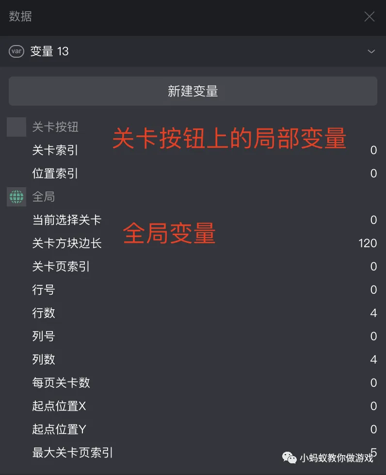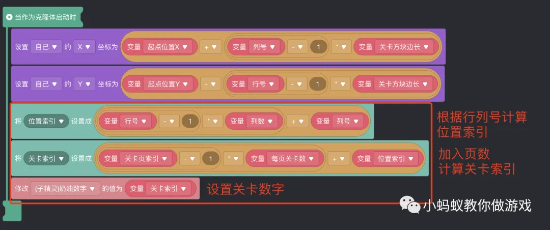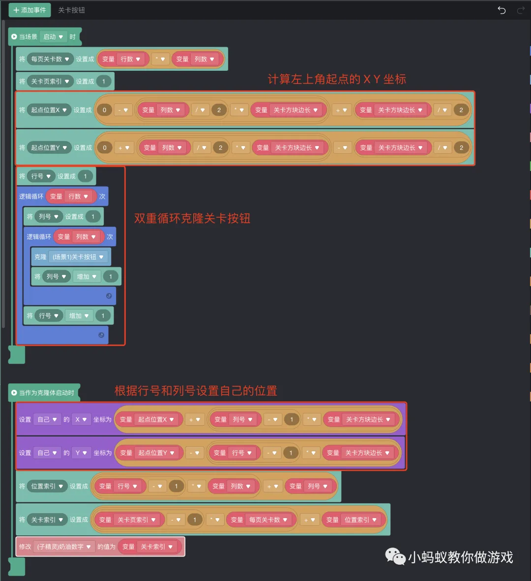 来看一下实现关卡按钮 4x4 排列布局的积木逻辑。