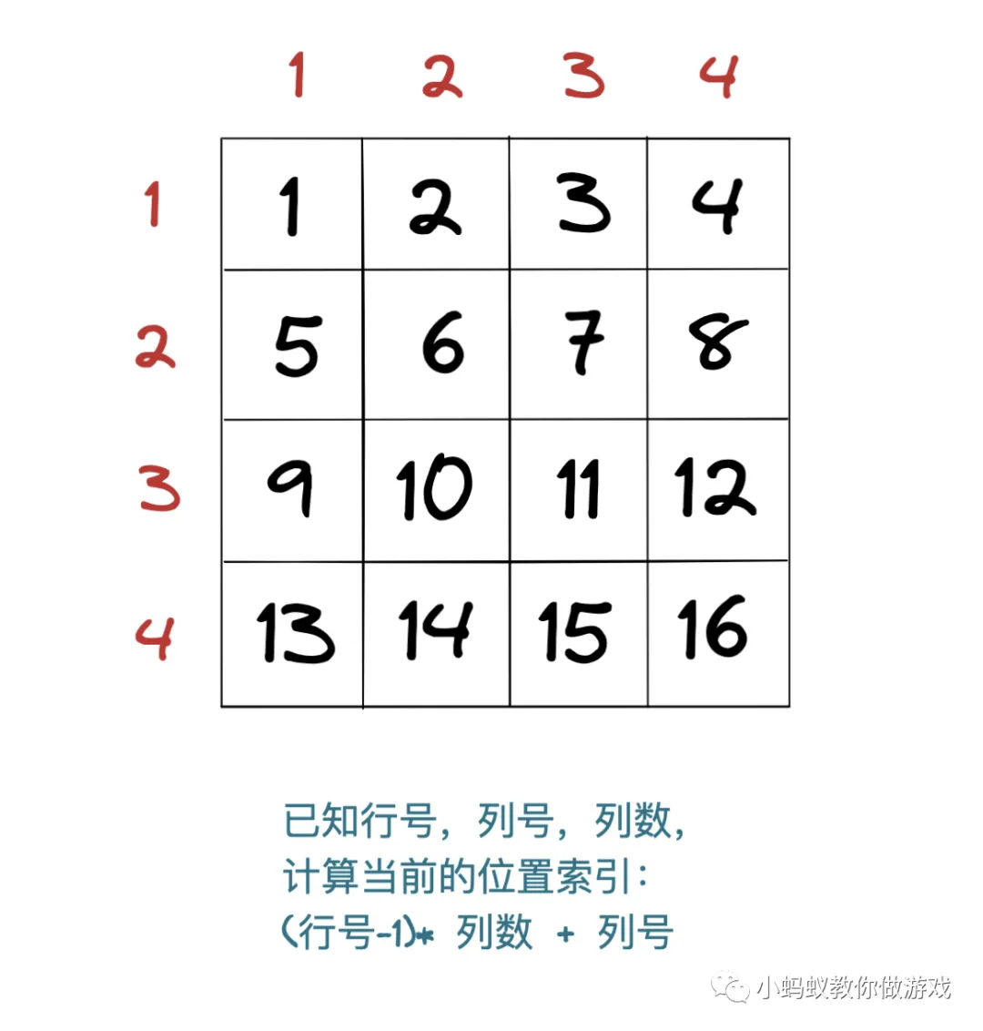 先来看一下这张图,这是一个 4 行 4 列的布局,在已知行号和列号的前提下,我们可以计算出当前行列号那个位置上的索引。比如说第 2 行第 3 列位置上的索引是 7。