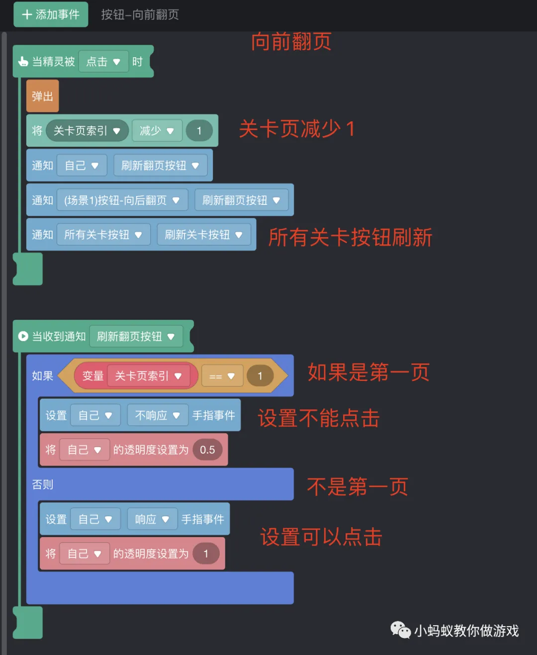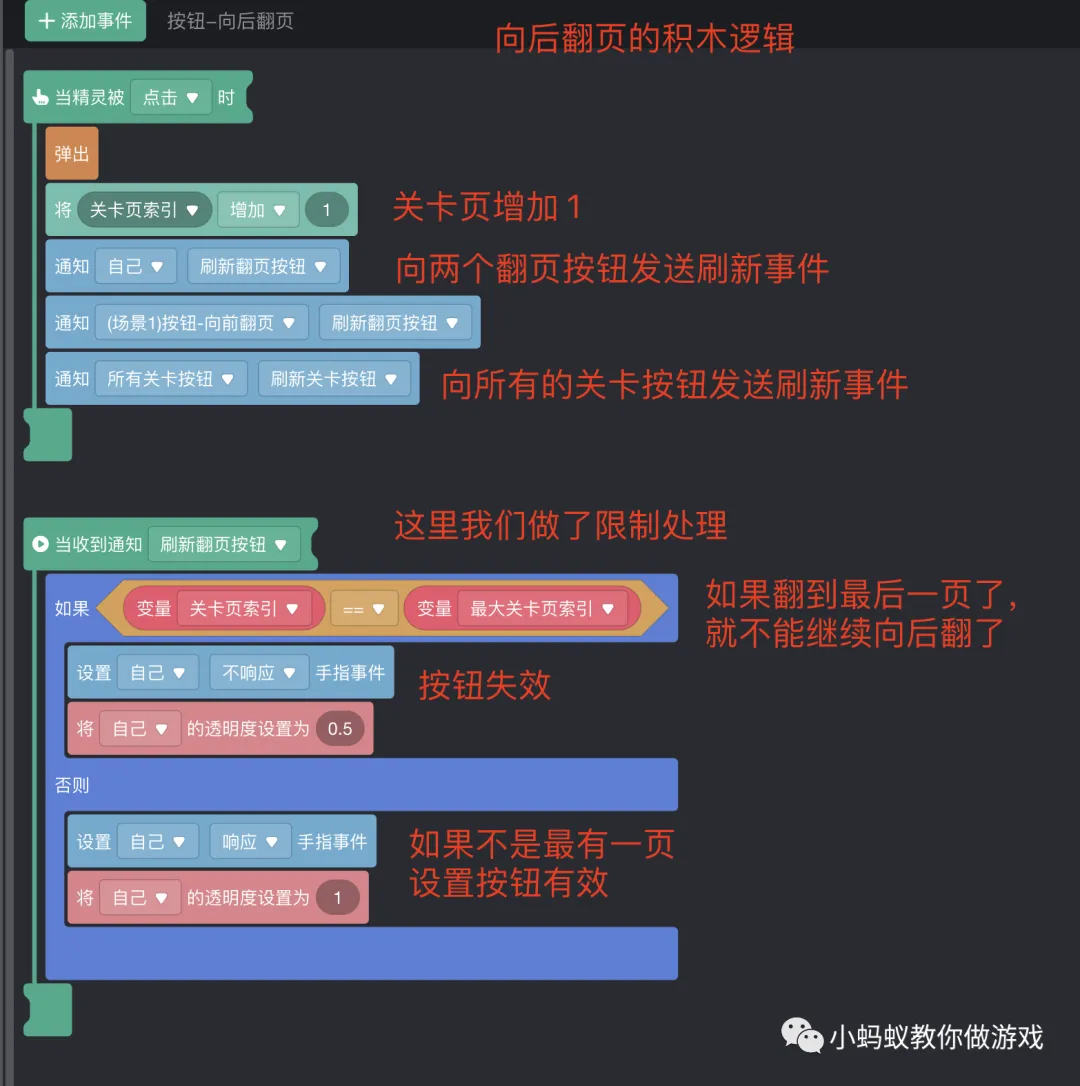 都做到这里了,实现关卡翻页就是水到渠成的事了。我们只需要增加两个翻页按钮,点击向后翻页的按钮,就把关卡页的索引增加 1 ,点击向前翻页的按钮,就把关卡页的索引减少 1,因为关卡页的索引改变了,所以所有按钮上的关卡数字也要重新计算一遍。