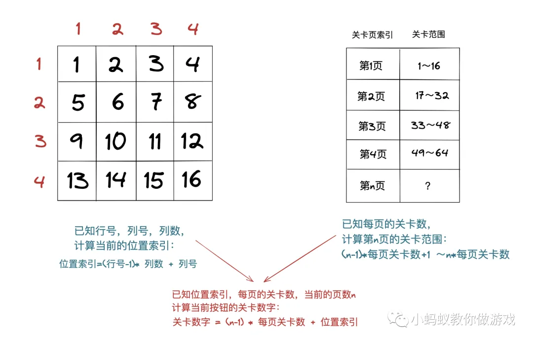 你可以举个例子带入计算一下,例如位于第3行,第4列,第3页的按钮,它的关卡数字是:(3-1)*16+(3-1)*4+4 = 44,所以这个按钮显示的关卡数字是 44。